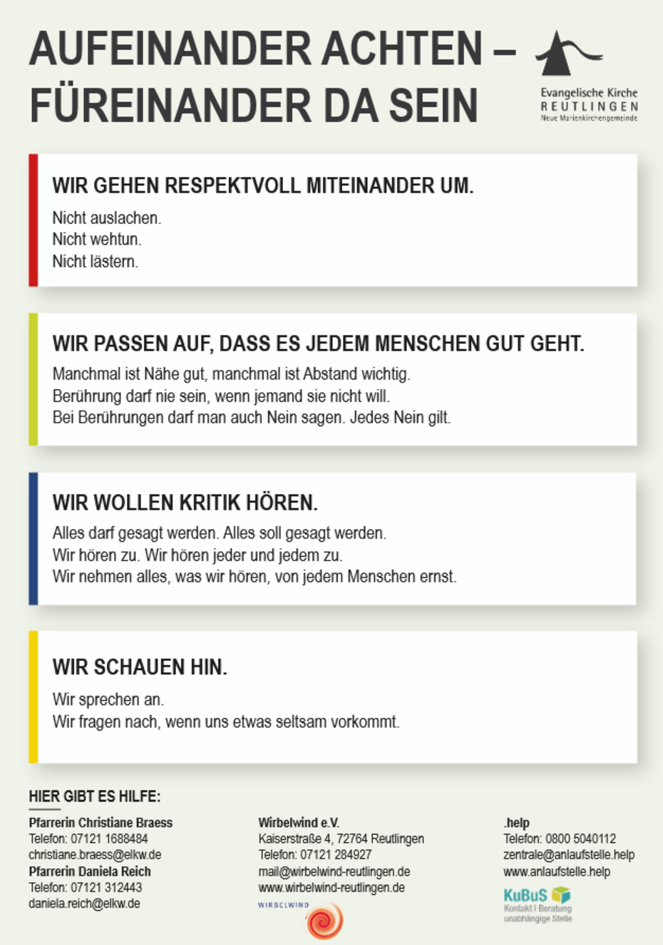 Der Kirchengemeinderat der Neuen Marienkirchengemeinde hat auf der Basis des Schutzkonzepts des Evangelischen Kirchenbezirks Reutlingen ein Schutzkonzept der Neuen Marienkirchengemeinde erarbeitet und beschlossen.